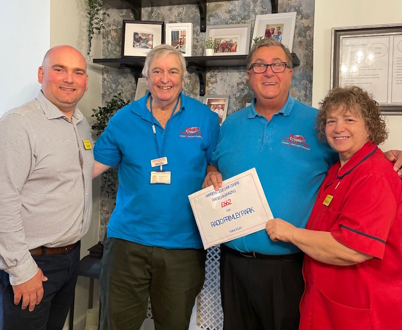 On Tuesday the 23rd of September, Malcolm Treen (Chair of Radio Frimley Park) and Steve King presenter, received £662 from Warren Lodge Care Centre which they had raised for the Hospital Radio station, during an open day.